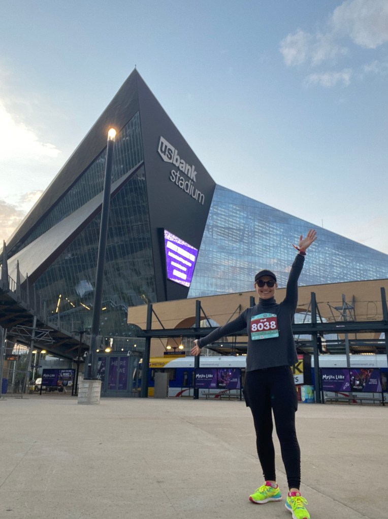 Looking back on the race, the Twin Cities Marathon crowd really kept me going. Though it wasn’t the largest crowd I had (Burlington) or the loudest (Philly), the Minnesotans knew how to have a good time. The same weekend as the race, the Minnesota Vikings were playing the New Orleans Saint. These Viking fans were not about to let the running Viking Fans finish the race without knowing the score. Cheering along the sidelines, everyone was dressed in the game-day purple best, and kept holding signs up with the current score, and the name of the most recent Viking touchdown player. Though I am not a Viking Fans, I did have Dalvin Cook on my Fantasy Team so I appreciated ALL of the updates. When the final score came down to 28 Vikings – 25 Saints, the race crowd absolutely lost it and started sharing vodka shots with the runners. The energy was contagious, and it gave me that extra push I needed to cross the finish line.
