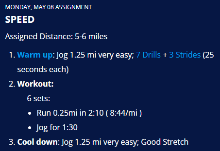 | Monday | Speed 5-6 miles |