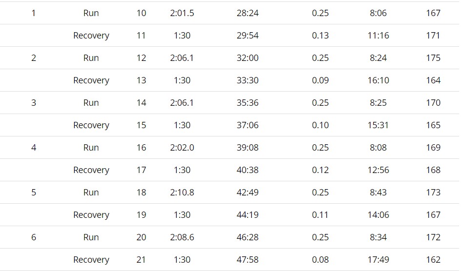 I tried my best to jog the recovery, but after the first 2 400ms, I had to walk during the recovery portion, then pick up jogging again after a minute of walking. You can see how I did get slower and slower, and part of that could have been because I wasn’t running on a track. The first one I did I knew it was a .25mile loop so I had the visual cue to when it would end, but the rest I did just on my normal running path. I was glad that I did make it under the recommended PACE each time (with 400m 5 being almost right at the 8:44/mile pace). But it was still a little upsetting to know in my “prime” I could do a 400 in 67seconds compared to 2 minutes.