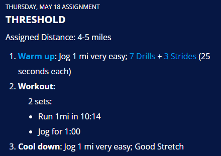 For the Threshold runs, I ran much faster than the suggest threshold (haha oops). First threshold mile was a 9:49/mile pace. I felt great during the whole thing. Started off faster and tried slowing down to be closer to the RunCoach pace. For the second mile, I ran it in a 9:24.7/mile and again, it felt easy and was enjoyable to do. I thought I was running slower than the first one, but then decided to just go for it – especially since I didn’t do the speed workout this week.