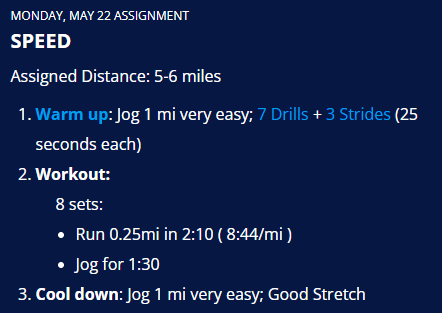 | Monday | Speed 5-6 miles |
