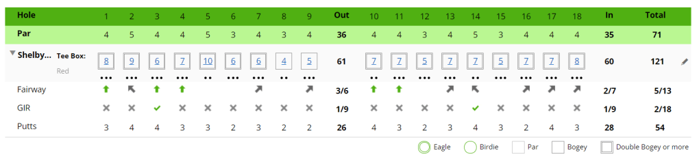 It was the first week of competitive play and G and I came out on top! The wind today was horrendous. We had to club up twice (use a smaller number club than normal) to even get somewhat close. Putting was also better today. Though I still had some three putts, I had more two putts or even a 1 put on hole 8 (where I shot a true par! First of the year)