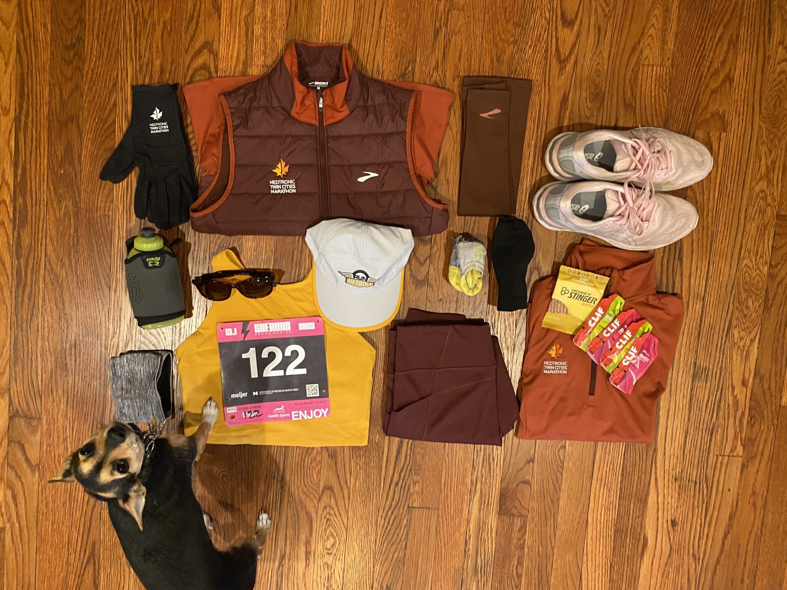 With the bib, we got our race shirts (which btw accidently spelled Michigan Miichigan) and some stickers. They also had boxed water and snacks, plus some personalized New Balance Gear for the race to purchase separately. I didn’t buy anything there because I purchased the embroidered full zip when I registered as I needed another warm layer.