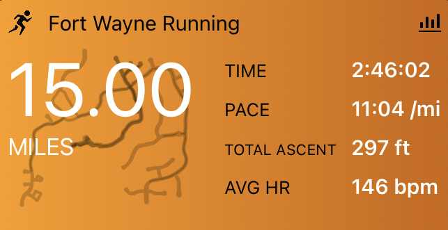 First time running 15miles this year and it went very well! I ran the 15miles with no walk breaks, and maintained my same fuel schedule – water every 5 minutes, fuel every 35mins.