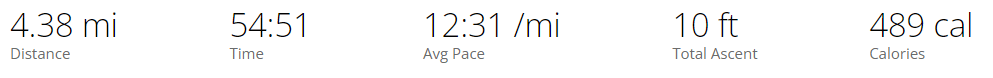 Had to cut this one short because a storm was coming in. So I only ran 1 mile at 8:42.9, then continued with my Cool Down jog after the walk break. Went back to my house and grabbed my dog to finish the mile with me as I knew he would not go out in the rain.